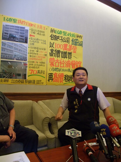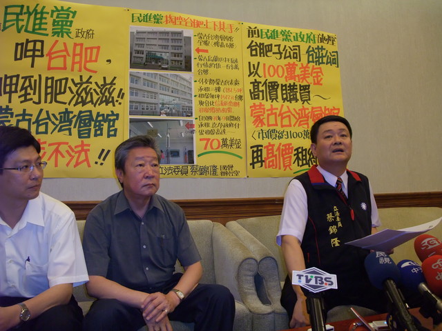 立法委員蔡錦隆於5/30(五)上午九時二十分於立院中興大樓106貴賓室召開記者會「痛批前民進黨政府非法掏空台肥-利用台肥子公司高價購買蒙古台灣會館」。經熟悉內情人士舉報,台肥公司於2001年由子公司-台莊公司以100萬美元購買蒙古烏蘭巴托臺灣會館,其主體為一高五層大樓,每層樓板面積約600平方米(約181.5坪),經調查蒙古當地房地產行情,蒙古台灣會館房價絕不可能高達100萬美元,其巿價僅值一百多萬台幣,台肥竟然以高價購置,背後是否經前民進黨政府授意令人起疑。