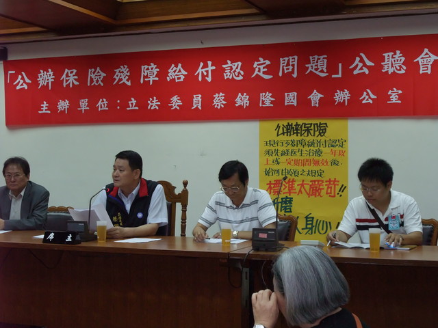 農保、勞保、公保等公辦保險,應立即檢討殘障給付認定應先經醫生治療一年以上無效後,始可申領之規定 立法委員蔡錦隆針對農保、勞保、公保,殘障給付規定過於嚴苛,特召開「公辦保險殘障給付認定問題」公聽會,要求農保、勞保、公保等公辦保險,應檢討現行殘障給付認定須先經醫生治療一年以上或一定期間無效後,始可申領之不合理規定。