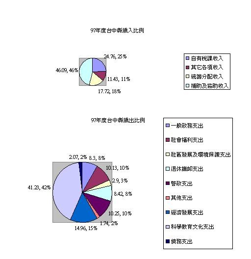 一、 97年度台中市政府總決算審定後歲入來源與歲出用途概況歲入341.22億元(自有稅課收入161.79億、其他各項收入49.35億、統籌分配收入37.24億、補助及協助收入95.79億),歲出356.40億元(一般政務支出32.77億、社會福利支出25.80億、社區發展及環境保護支出18.66億、退休撫卹支出35.66億、警政支出44.12億、其他支出5.07億、經濟發展支出81.84億、教育科學文化支出111.13億、債務支出1.31億),短絀15.18億元。