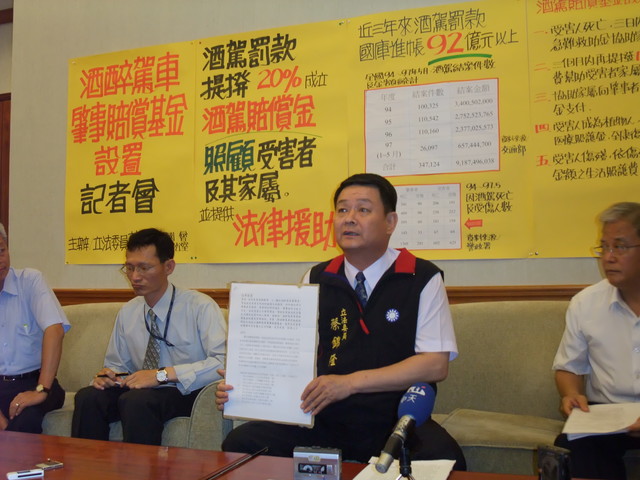 立法委員蔡錦隆針對政府處理酒駕肇事問題,一直未將問題重心提出解決的根本之道,也未重視酒駕肇事受害者及其家屬的事後賠償、生活等問題,爰提出「酒醉駕車肇事賠償基金設置」。檢視我國近年酒駕肇事死亡人數自93年454人,94年547人死亡,95年更上升至727人,有每年俱增的趨勢,可見政府雖祭出重罰,但仍有許多民眾甘冒被酒測的風險來酒醉駕車。