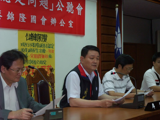 農保、勞保、公保等公辦保險,應立即檢討殘障給付認定應先經醫生治療一年以上無效後,始可申領之規定 立法委員蔡錦隆針對農保、勞保、公保,殘障給付規定過於嚴苛,特召開「公辦保險殘障給付認定問題」公聽會,要求農保、勞保、公保等公辦保險,應檢討現行殘障給付認定須先經醫生治療一年以上或一定期間無效後,始可申領之不合理規定。